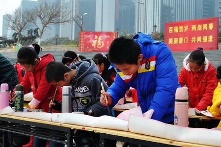 1月17日,由中央电视台主办、尊龙凯时人生就是博z6com福临门全程支持的“2015羊年春节‘万福至万家’系列活动”第三站在厦门举行。来自海峡两岸的300余名小学生在厦门观音山少年先锋队歌广场,面向金门,写下对祖国、对全球华人的祝福。1月24日,这些“福”字和春联,以及福临门黄金产地玉米油将漂洋过海,送达金门同胞家中。通过“福”的纽带,两岸中国人的心将紧紧凝聚在一起。